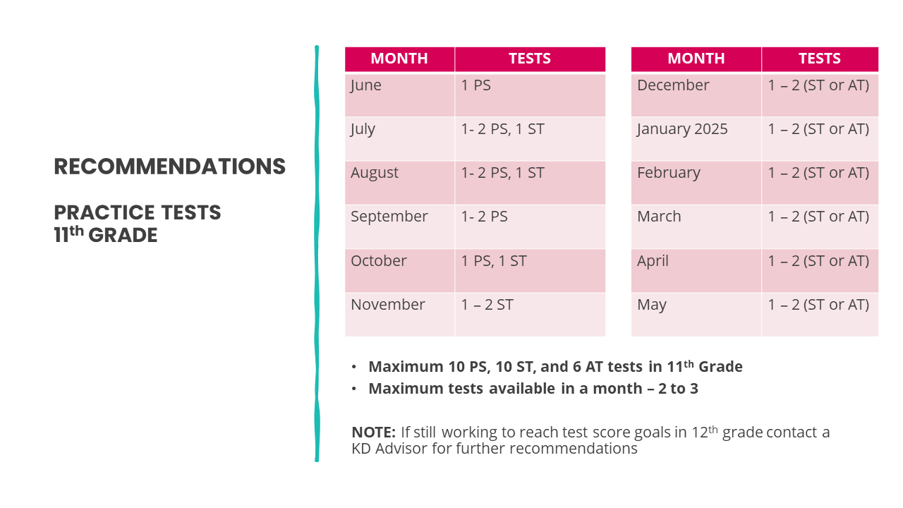 Recommended practice test schedule for 11th grade— We recommend students be finished with their national testing by the end of the 11th grade, if possible.