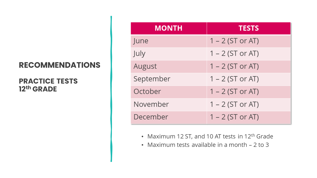 Recommended practice test schedule for 12th grade— 12th graders should contact their KD campus to speak with an advisor about a testing plan that’s specific to their goals.