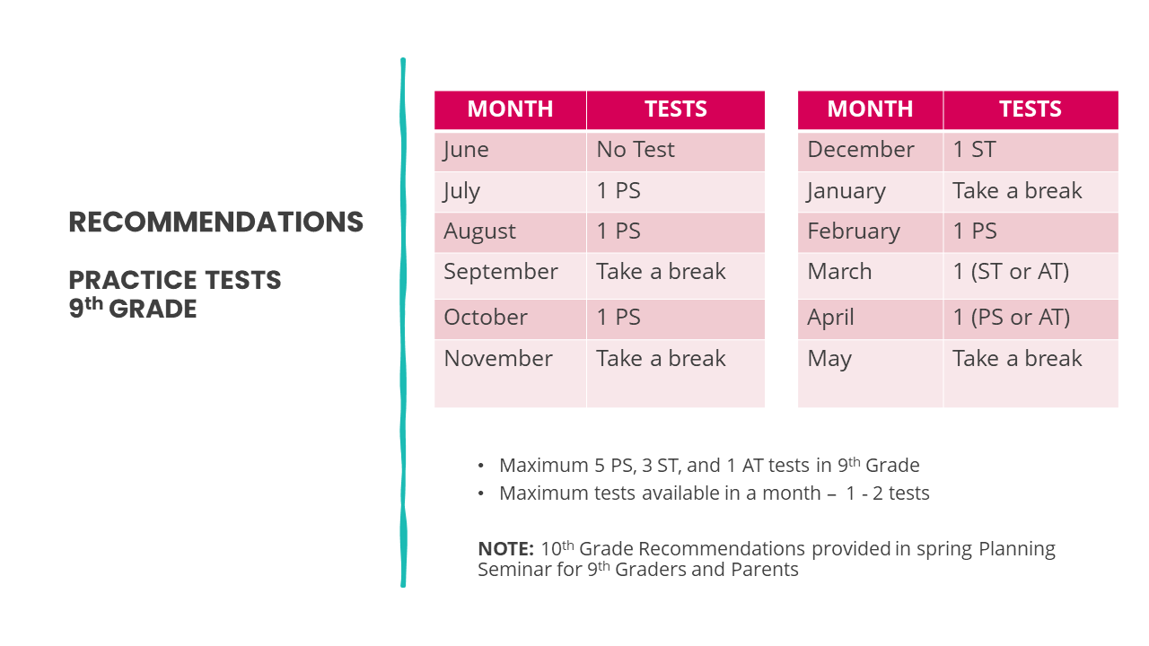 Recommended practice test schedule for 9th grade—9th graders have plenty of time. It’s important to balance consistent practice with not overloading a younger student.